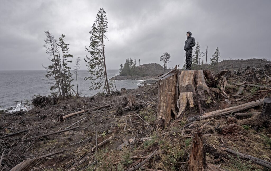 Joshua Wright bends low over a stump, counting its tightly packed rings. Certainly 500, maybe 700, it’s hard to tell in the driving rain. This stump he and DellaSala are standing on is as wide as they are tall. “Who knew this could happen?” says Wright, looking at the clear-cut, with nearly every tree taken, all the way to the beach fringe. So close to the beach, delicate domes of sea urchin shells sit amid the logging slash, as do abalone shells, dropped by seabirds, their shimmering opalescent colors so out of place in a bleak ruin of stumps.