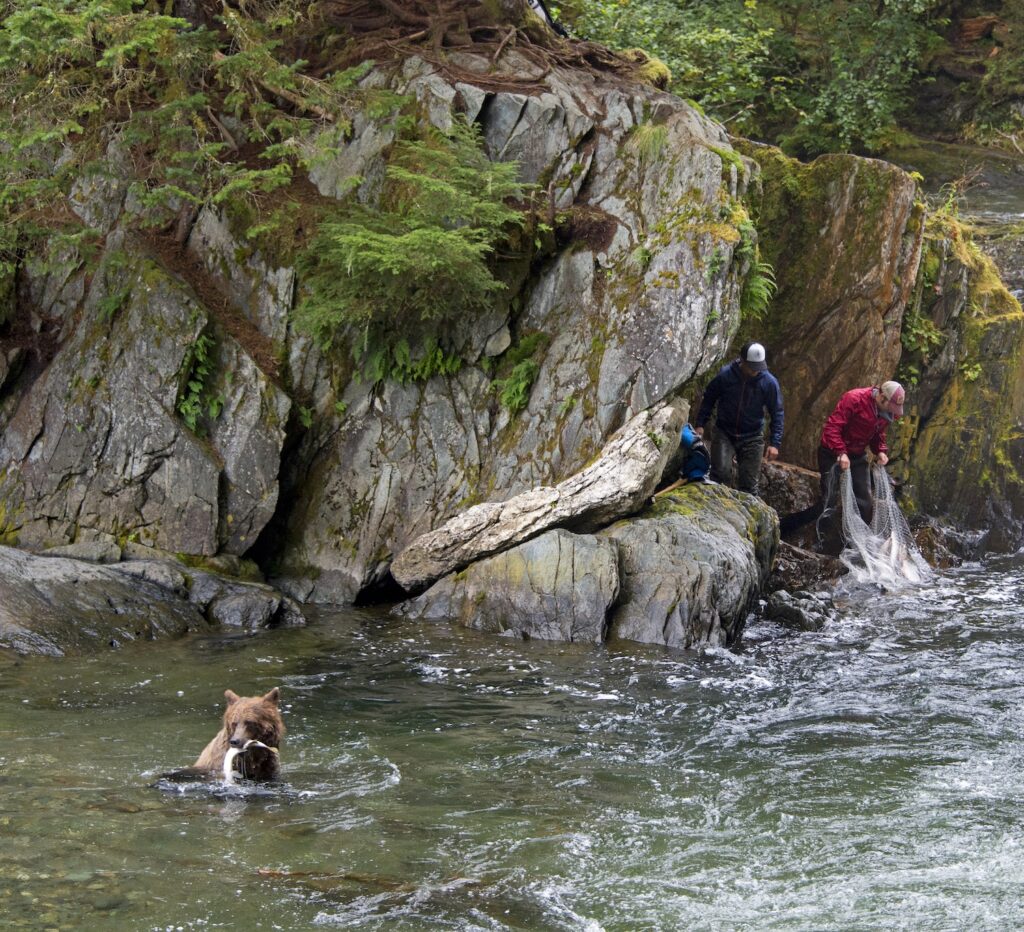 Rain drips from the tips of branches of a grandmother cedar, growing for centuries. In verdant moss amid hip-high sword ferns, the bones of a salmon gleam, picked clean by feasting wildlife. “Gronk,” intones a raven, from somewhere high overhead in the forest canopy.