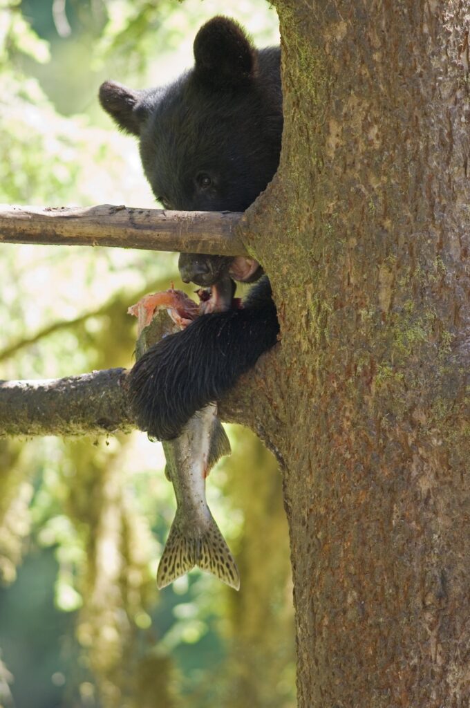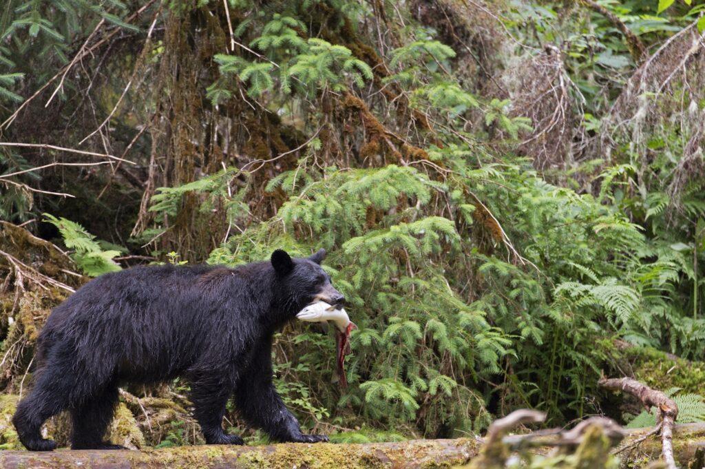In the forest, looming Sitka spruce, western hemlock, and cedars quill a lush understory of salal and huckleberry. Life grows upon life, with hanks of moss and lichen swaddling trunks and branches. Nothing really dies here, it just transforms into new life. Fallen logs are furred with tree seedlings, as a new generation rises. After they spawn, salmon die — and transubstantiate into the bodies of ravens, bears, and wolves they nourish.